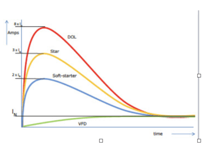 La grafica Verde es la corriente que consume el motor en el arranque con un VFD y puede ser hasta 8 veces menor.